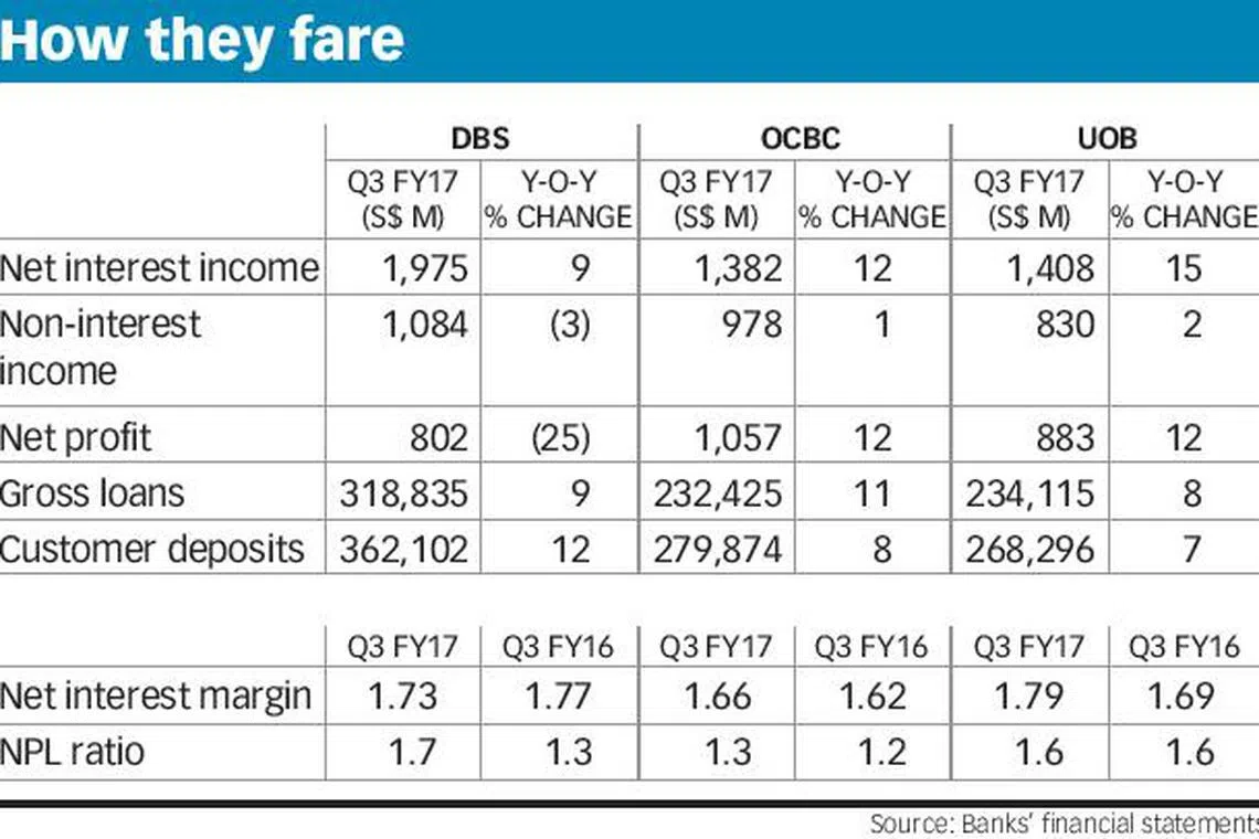 Over at DBS, net interest income rose 9 per from a year ago to S$1.98 billion, while net fee and commission income was up 12 per cent to S$685 million.