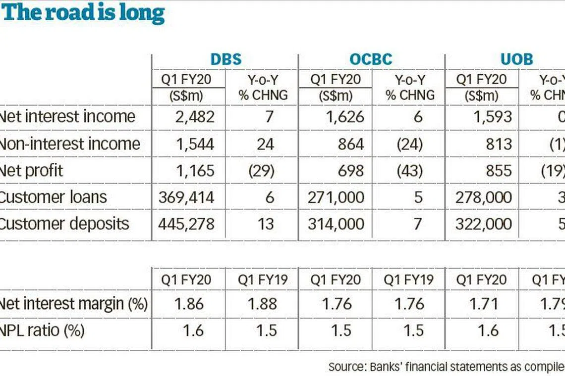 SINGAPORE banks posted lower earnings in the first quarter after fattening their provisions to cushion against economic stresses brought on by the virus outbreak, as well as against some of their oil-and-gas exposure.