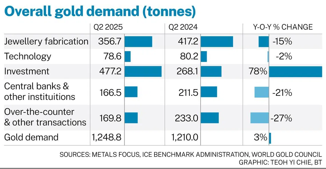 Overall, total gold demand reached 1,248.8 tonnes, including over-the-counter transactions. This was a 3 per cent rise on the year amid a high-price environment, where annualised gold prices stood at US$3,280.4 per ounce in the quarter, based on the report.