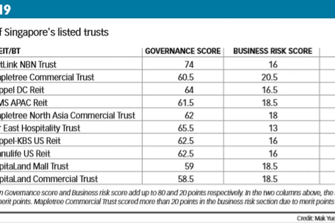 More established trusts also did well. Far East Hospitality Trust, for example, showed one of the greatest improvements, gaining 15 points from last year and moving up from 29th to joint sixth this year.