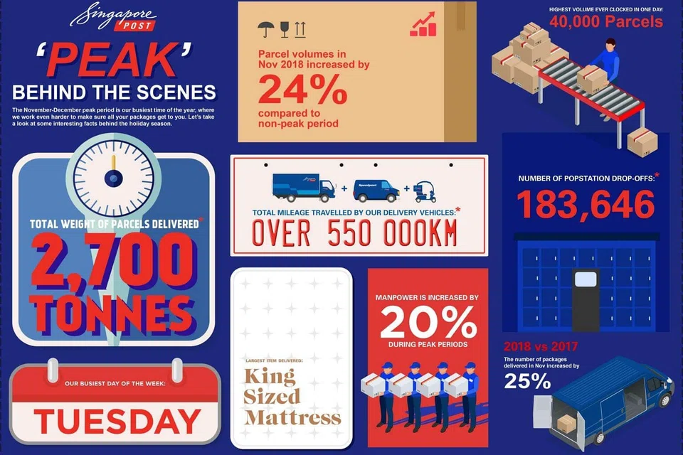 To cope with the volume, SingPost said that SP Parcels increased staff manpower by 20 per cent while courier working hours were also extended by two hours during the period.