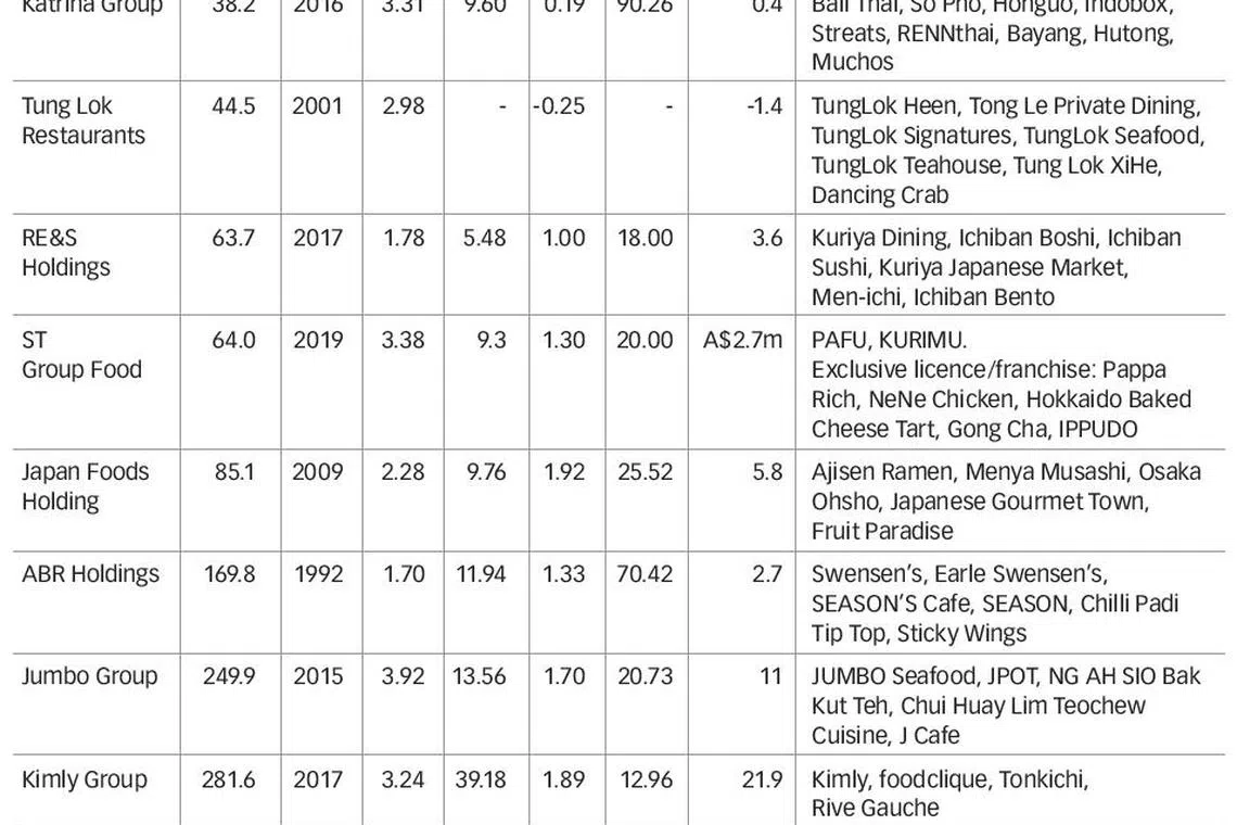 Jumbo Group, BreadTalk Group and Kimly Group all place within the top 200 stocks by market value as well as daily trading turnover.