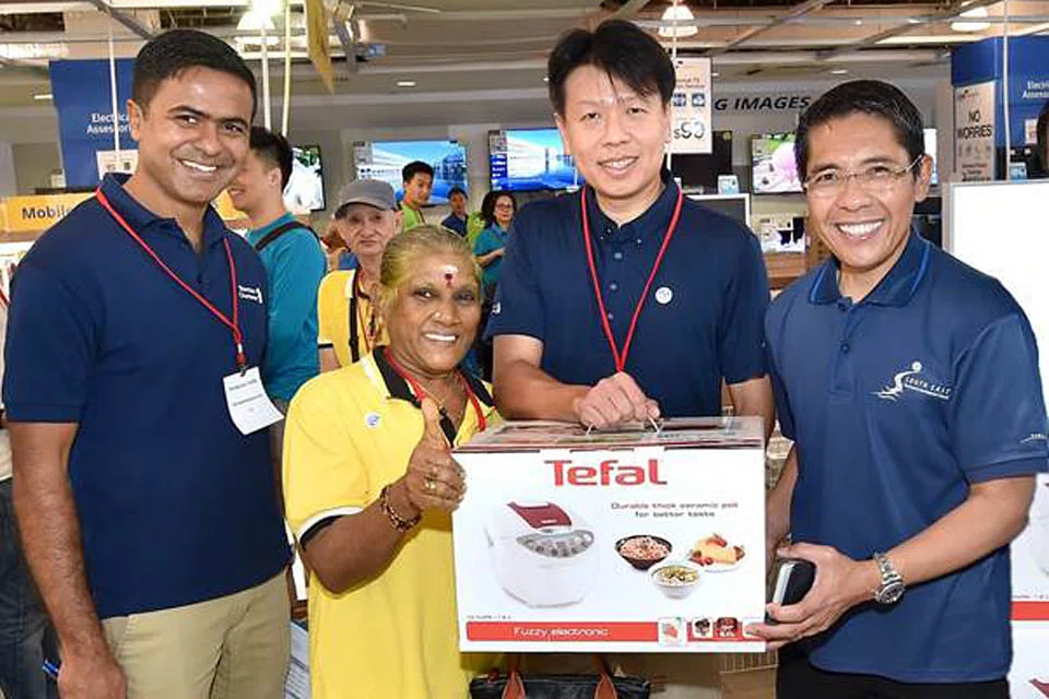 (From left) Dwaipayan Sadhu, head of products and segments (Singapore and Asean & South Asia) at Standard Chartered; Andrew Chia, head of retail banking (Singapore) at Standard Chartered; Maliki Osman, Mayor of South East District; and Parwathy Ammal Kavana Armugam with her newly-purchased rice cooker. Ms Parwathy is one of forty seniors from Thye Hua Kwan Bedok Radiance Senior Activity Centre (SAC) and Thye Hua Kwan SAC @ MacPherson who were treated to a Deepavali shopping trip on Saturday morning at Courts Toa Payoh. They were accompanied by volunteers from the bank and the South East Community Development Council, who took the seniors around to shop for household items on their wish list.