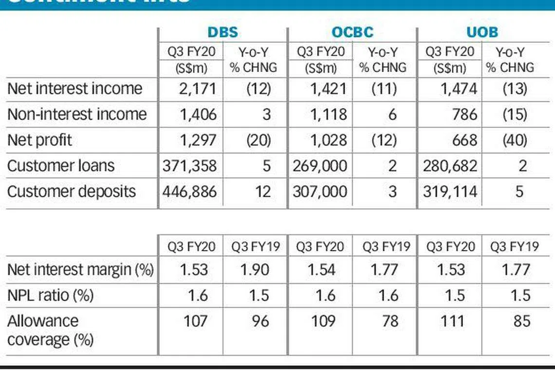 DBS' net profit for its third quarter fell 20 per cent to S$1.30 billion as the bank continued to bulk up allowances from the year-ago period. Total allowances more than doubled from a year ago to S$554 million for the quarter. Its results outshone an average estimate of S$1.17 billion from four analysts, Refinitiv data showed.