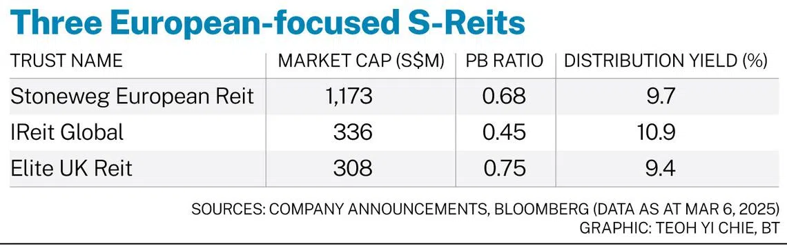 There are three Singapore-listed real estate investment trusts (S-Reits) that are Europe-focused – Elite UK Reit , IReit Global , and Stoneweg European Reit .