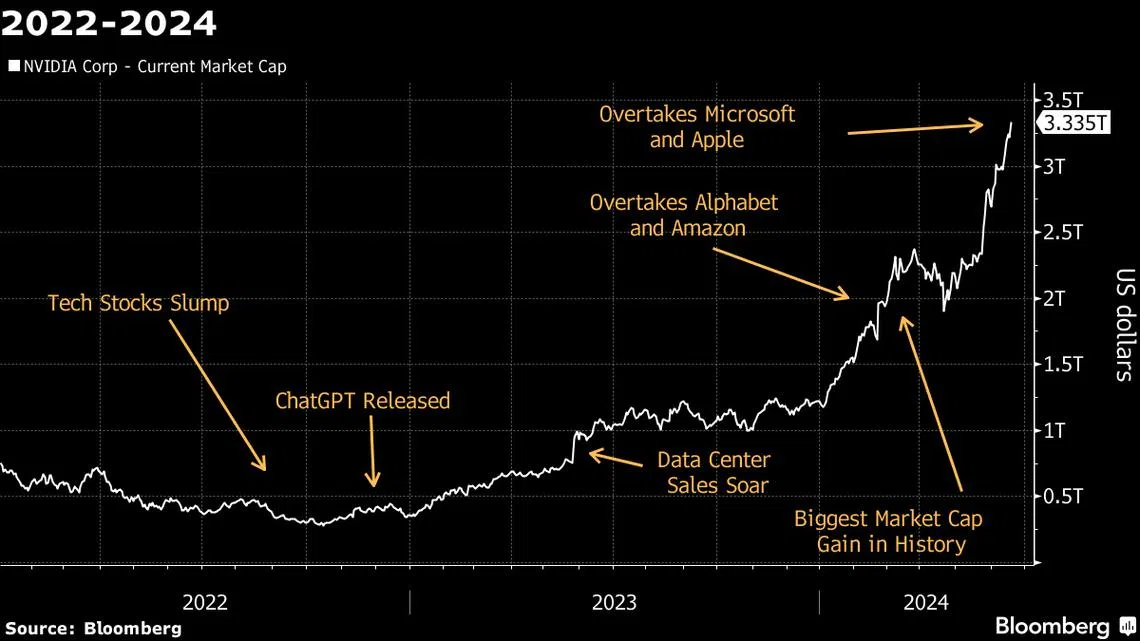 On Tuesday (Jun 18), that run culminated in Nvidia unseating Microsoft as the world’s most valuable company with a market capitalisation of US$3.34 trillion. More than US$2 trillion of that value has been added this year.