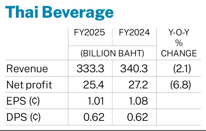 [SINGAPORE] Thai Beverage posted a 6.8 per cent drop in net profit to 25.4 billion baht (S$1.02 billion) for the full year ended Sep 30, 2025, from 27.2 billion a year earlier.