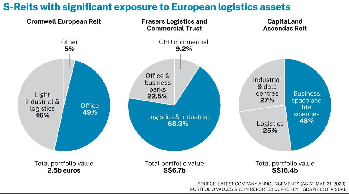 Listed in Singapore are three Reits with significant exposure to European logistics real estate properties – Cromwell European Reit , Frasers Logistics & Commercial Trust , and CapitaLand Ascendas Reit .