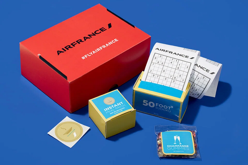 In a time of low-cost airlines, where your ticket might not include a hot meal or free access to electronic entertainment, the box reminds you of what could be if you shell out a little more on Air France.