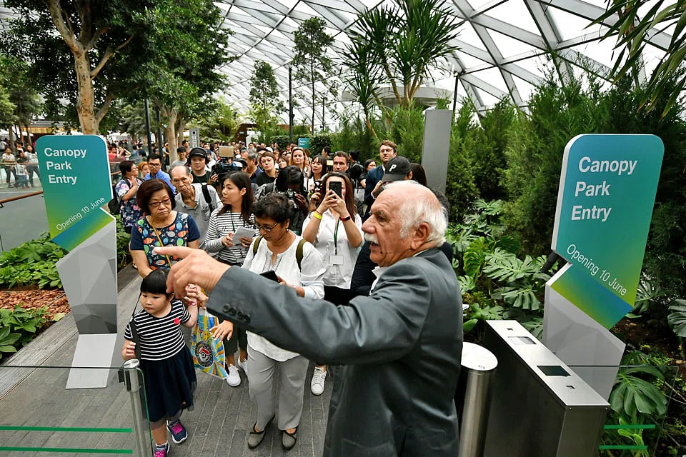 On a private tour of Jewel, he points to retractable shades mounted on the roof, which help provide shade to the Canopy Park, especially at noon.