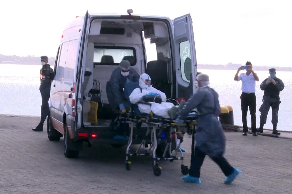 A woman, breathing from an oxygen bottle carried by a doctor, was helped off a Uruguayan naval launch onto a stretcher on Friday, she too dressed in biohazard gear. Another person was brought ashore on Sunday night, wheeled to a waiting ambulance.