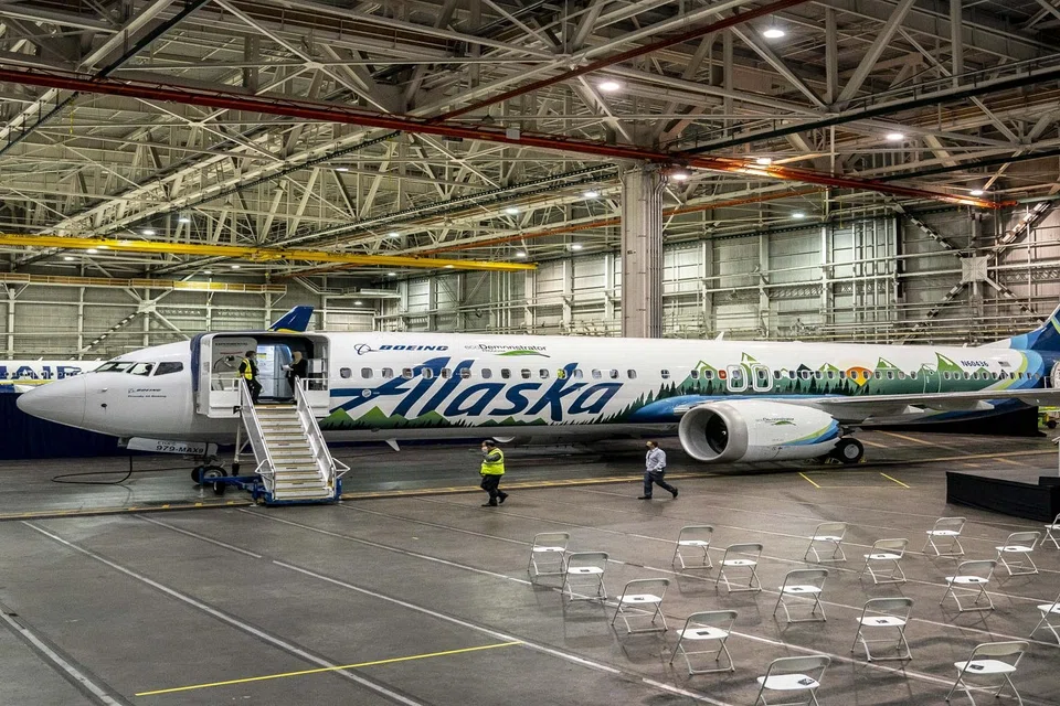 Boeing's event at its flight test hangar in Seattle was anchored by an Alaska Airlines 737 MAX 9 flying demonstrator equipped with potential upgrades like a drag-reducing warning light and cabin sidewalls made from recycled carbon fibre.