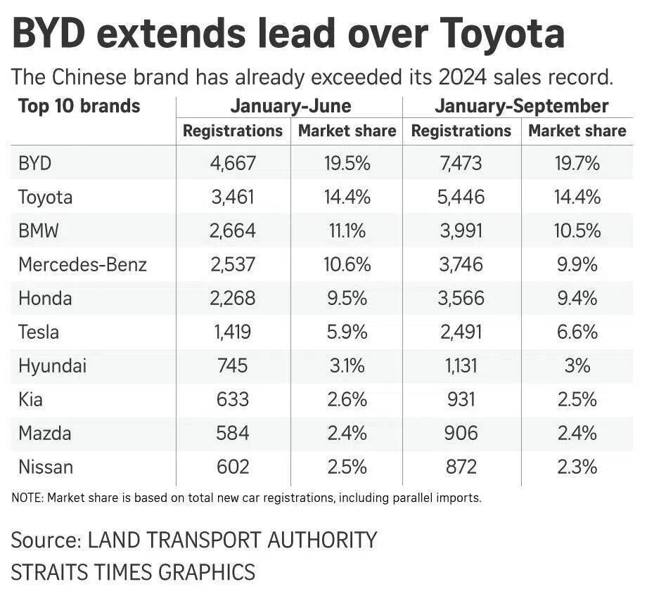 [SINGAPORE] BYD, the top-selling car brand in Singapore, registered 7,473 cars here in the first nine months of 2025, extending its lead over Toyota.