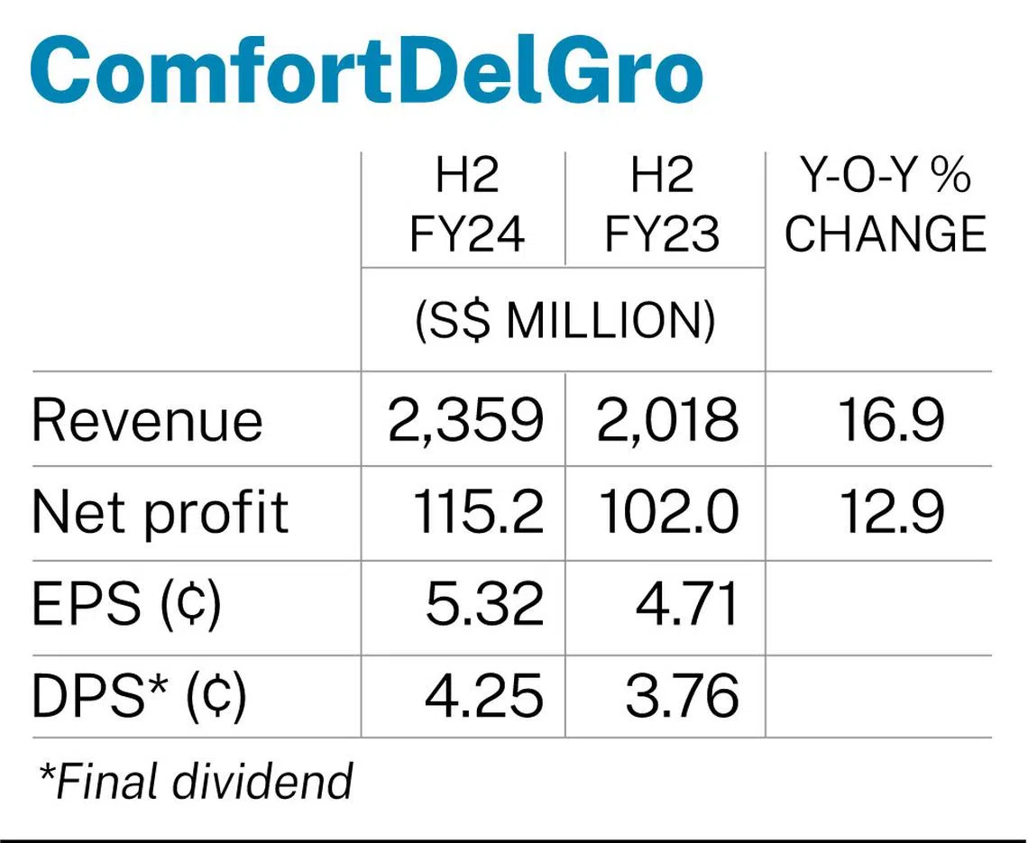 COMFORTDELGRO reported a 12.9 per cent year-on-year rise in earnings to S$115.2 million for the second half of financial year 2024 ended December.