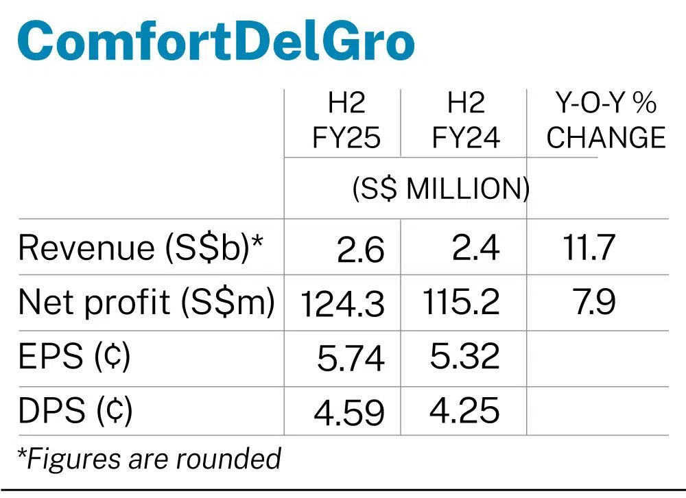 [SINGAPORE] Transport operator ComfortDelGro (CDG) reported a 7.9 per cent year-on-year rise in earnings to S$124.3 million for the second half of the financial year 2025 ended December.