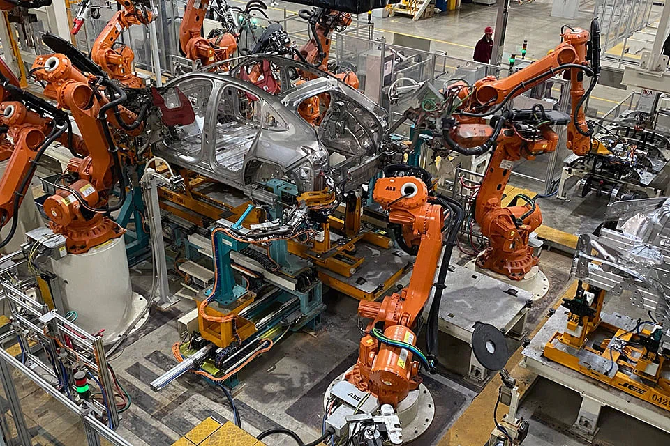 Rows of bright orange, 15-foot-tall robots - 307 of them, mainly from Sweden - whir with activity. They glue lightweight aluminium panels to vehicle frames using aerospace-grade adhesives. In an industry in which speed can mean cost efficiency, the assembly line plods along at half the pace of many lines elsewhere.
