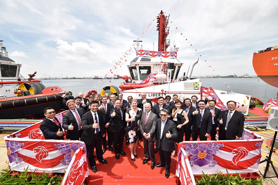 At a ceremony to formally name the dual-fuelled vessel KST Liberty were the guest of honour, the permanent secretary of Singapore's Ministry of Transport Loh Ngai Seng (front row, extreme right) and the chief executive of Keppel O&M Chris Ong (front row, second from left).