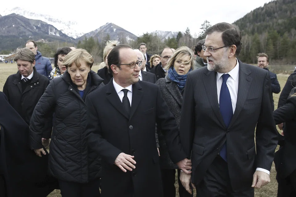 French President Francois Hollande and German Chancellor Angela Merkel flew over the crash site to see the devastation for themselves before meeting rescue workers outside the crisis centre set up on Tuesday after the worst crash in France in four decades.