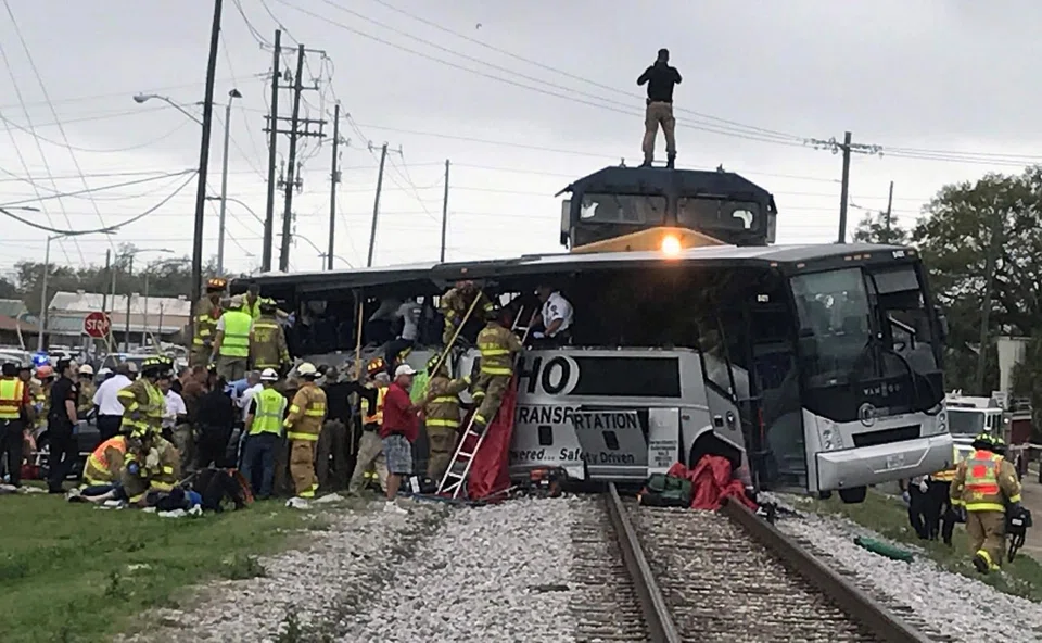 [BILOXI, Mississippi] At least four people were killed and dozens injured on Tuesday when a freight train slammed into a charter bus at a railroad crossing in Biloxi, Mississippi, officials said.