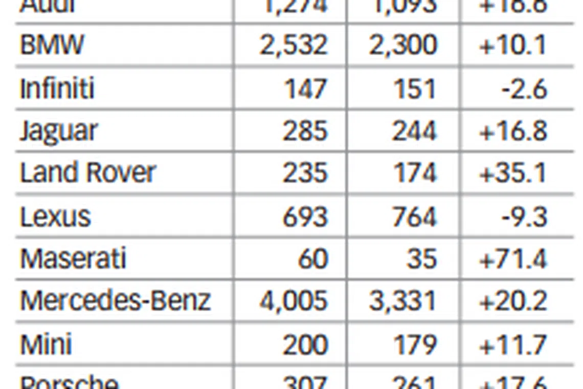 The brand with the three-pointed star stayed ahead not only as Singapore's most popular premium make but also the one with the biggest year-to-date growth - 674 units comprising registrations from both exclusive Merc dealer Cycle & Carriage as well as parallel importers.