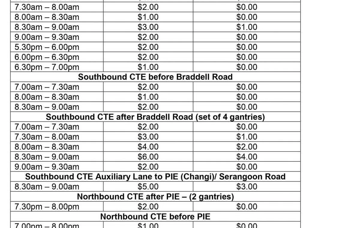 S$3 for the southbound CTE auxiliary lane to PIE (Changi)/Serangoon Road from 8.30am to 9am.