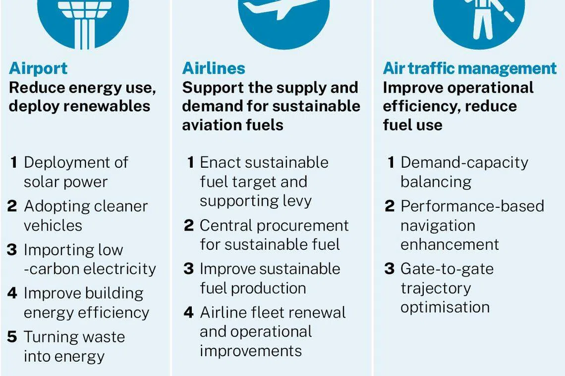 The blueprint’s 12 initiatives to lower emissions cover three areas: airport, airline and air-traffic management.
