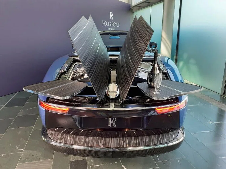 [ENGLAND] A convertible Rolls-Royce with a back deck that opens up to reveal cocktail tables, fridges for champagne and a parasol matching the vehicle's baby blue colour scheme is now a reality - for one ultra-wealthy individual.
