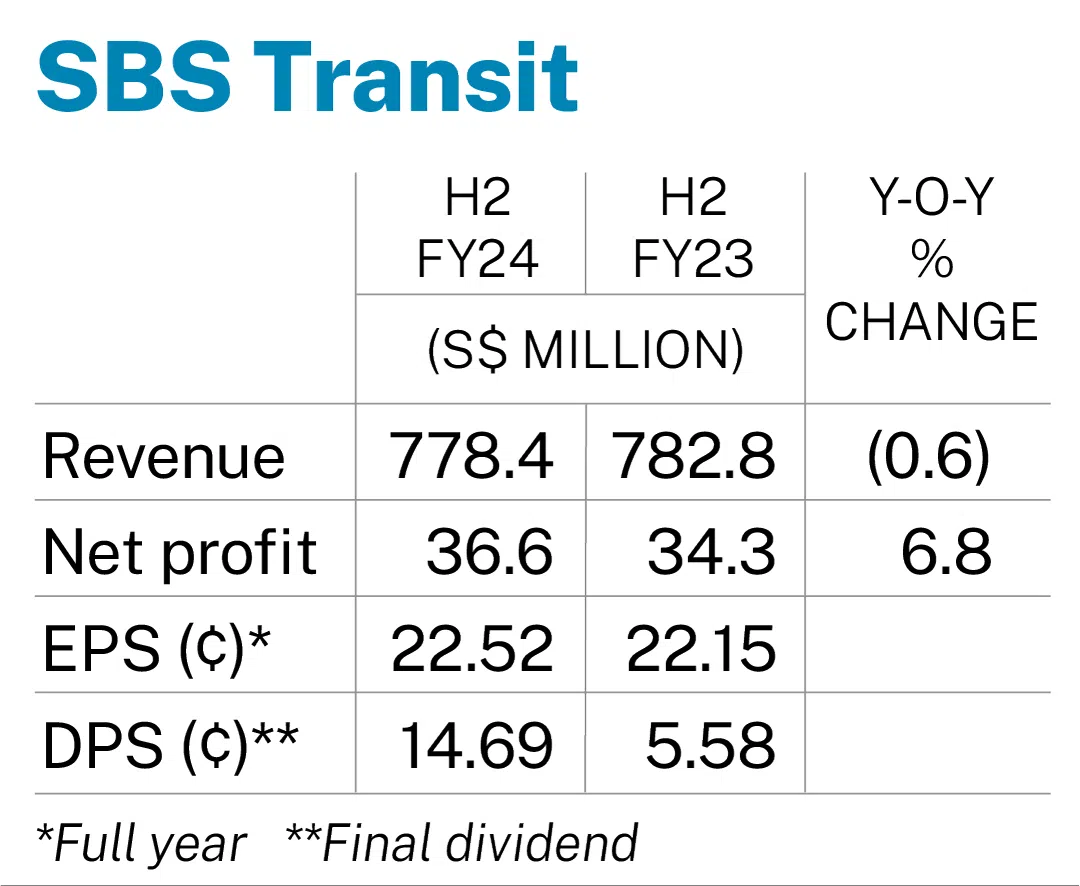 The group has proposed a final dividend of S$0.1469 and a special dividend of S$0.0841 per share, making it S$0.2868 in total, including the interim dividend of S$0.0558. SBS Transit said this was in line with its policy of paying at least half of its profits as dividend.