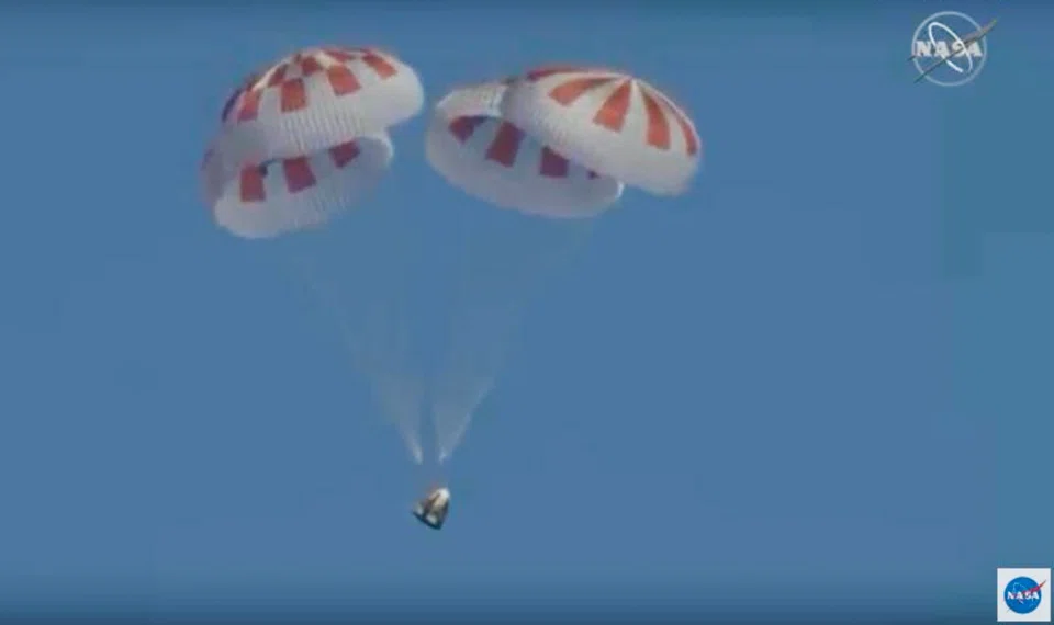 Live footage from Nasa showed the capsule's main parachutes opened without a hitch, and it splashed down at 8:45 am (1345 GMT), completing a mission to demonstrate that it could reliably and safely carry astronauts to the International Space Station (ISS).