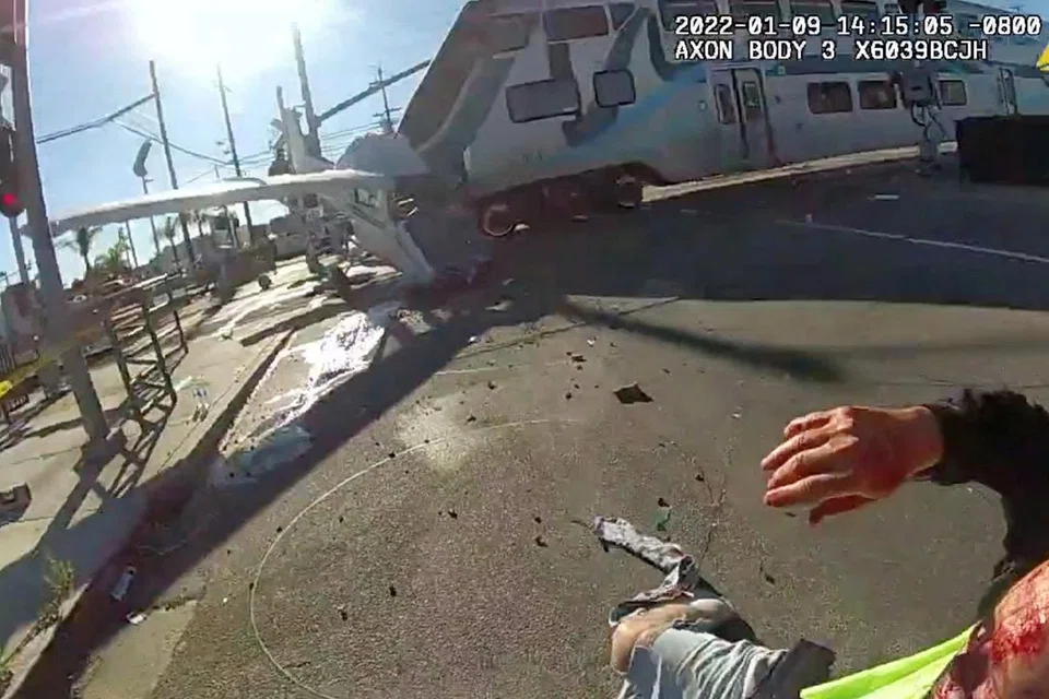 In bodycam footage, the bloodied pilot can be seen trapped in his cockpit as Los Angeles police officers desperately work to free him.