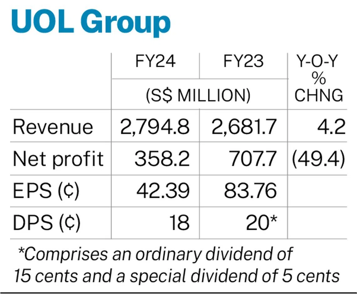 PROPERTY player UOL Group posted a 60 per cent fall in net profit to S$227.8 million for the six months ended Dec 31, 2024. This was mainly due to the absence of a one-time gain from the sale of Parkroyal on Kitchener Road in October 2023.