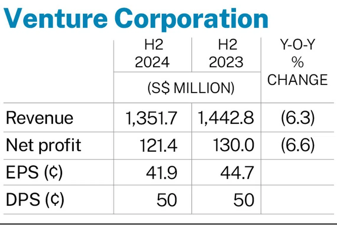 VENTURE Corporation posted a 6.6 per cent year-on-year decline in net profit to S$121.4 million for the half year ended Dec 31, 2024, from S$130 million.
