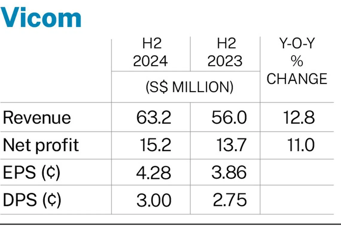 VEHICLE Inspection company Vicom posted 11 per cent higher net profit of S$15.2 million for the half-year ended Dec 31, 2024, from S$13.7 million in the year before.