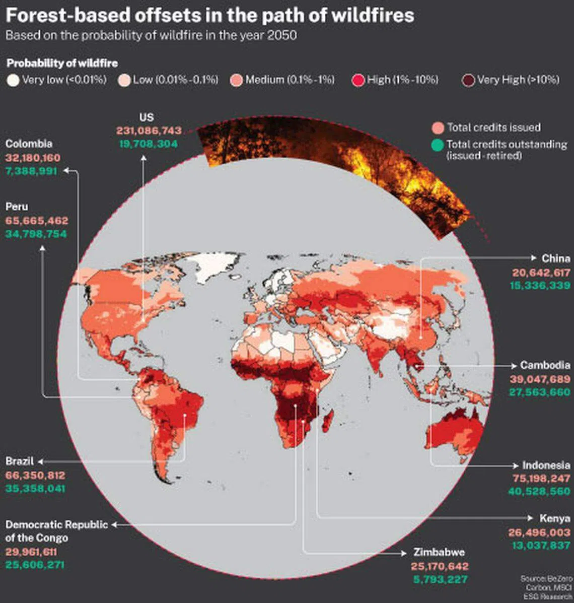 Meanwhile, some parts of Indonesia face a “high” risk of wildfire, or a 1 to 10 per cent probability by 2050, it noted. The country, with 75.2 million issued credits, hosts 40.5 million outstanding credits. These issuances in the region are large compared to China, where only 20.6 million credits were issued.