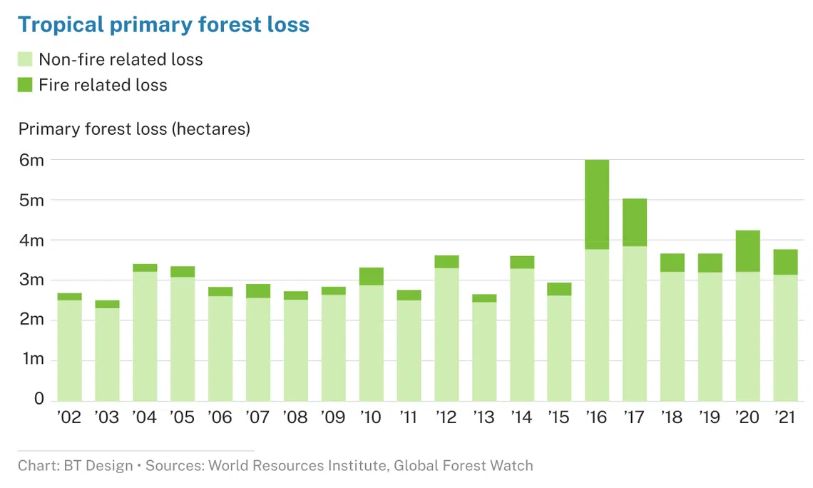 Wildfires, itself a consequence of climate change-induced heat and drought, are still not the main contributors to the loss of tropical primary forests, however. The bulk is destroyed by deforestation, including clearing for agriculture and logging, MSCI said.