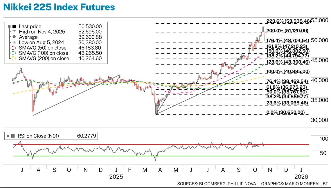 On the Osaka Nikkei 225 Mini Futures, the contract has rallied from its April low of 30,650 yen, to test the 51,120 yen mark (200 per cent Fibonacci extension) before the Nov 5 tech-led sell-off.