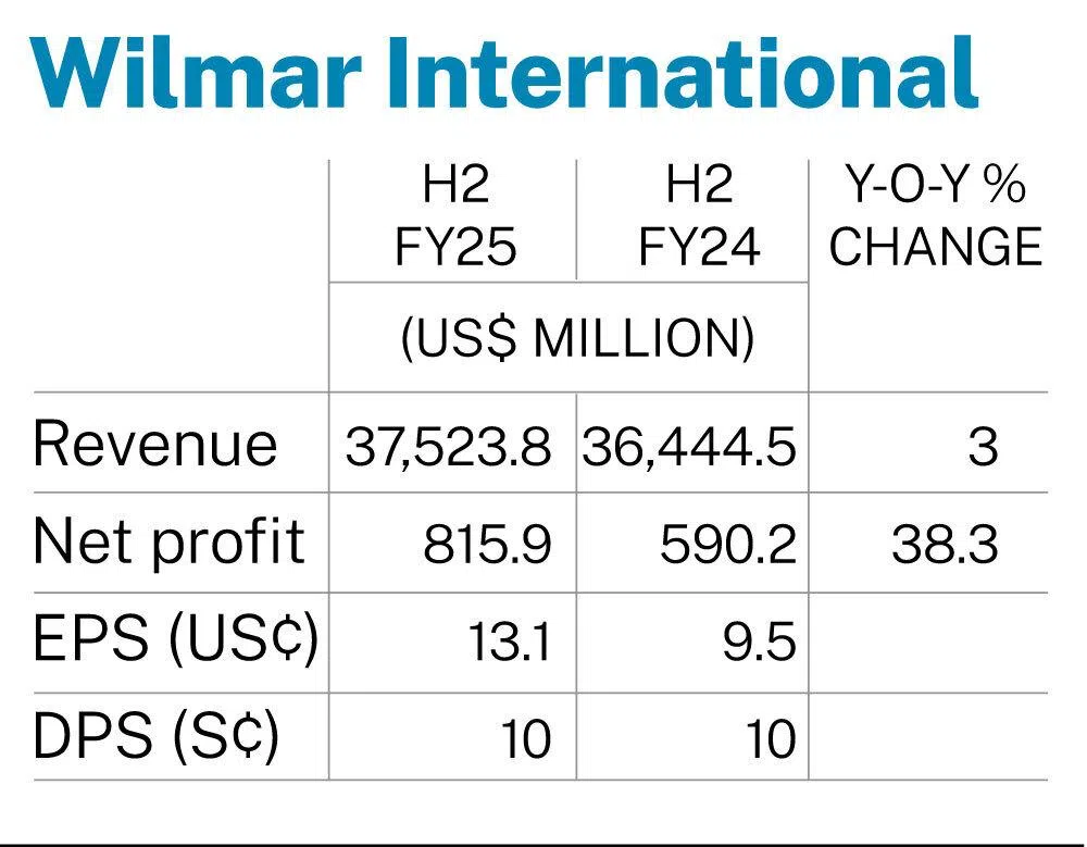 [SINGAPORE] Agribusiness Wilmar International on Thursday (Feb 26) posted a 38.3 per cent rise in net profit to US$815.9 million for its second half ended Dec 31, 2025, up from US$590.2 million for the same period a year prior.