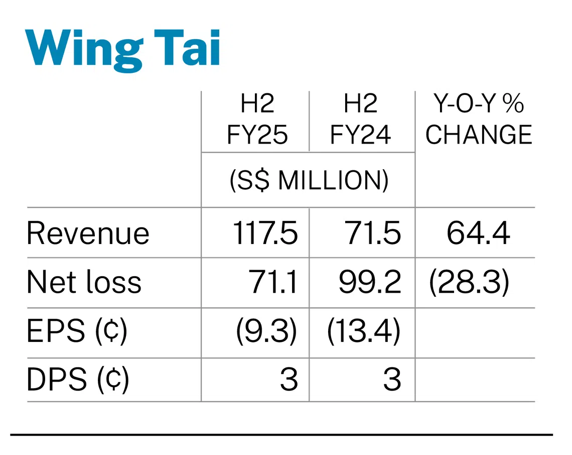 [SINGAPORE] Property developer Wing Tai narrowed its net loss in the second half of its 2025 fiscal year ended Jun 30 to S$71.1 million, down from S$99.2 million a year ago.