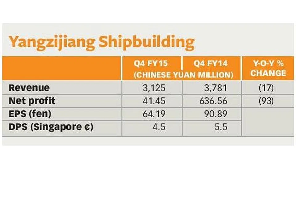 YANGZIJIANG Shipbuilding (YZJ) saw its fourth-quarter net profit plunge to 41.45 million yuan (S$8.9 million), 93 per cent down from 636.56 million yuan a year ago mainly on higher impairments and foreign exchange-related losses.