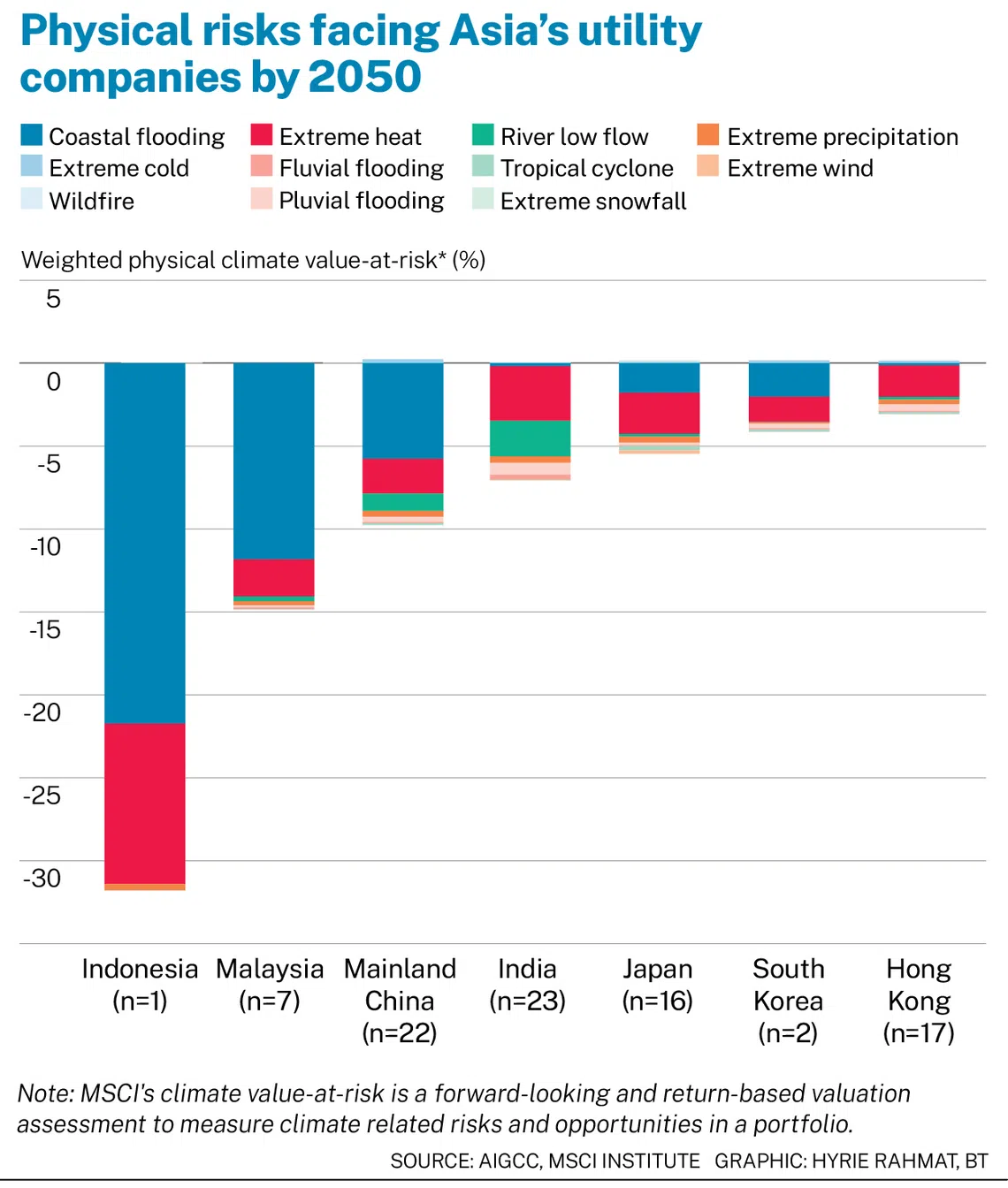 Utility companies in Indonesia were projected to have the highest valuation declines of around 30 per cent by 2050 due to their exposure to physical climate hazards. Malaysia came in second with expected valuation declines of around 15 per cent.