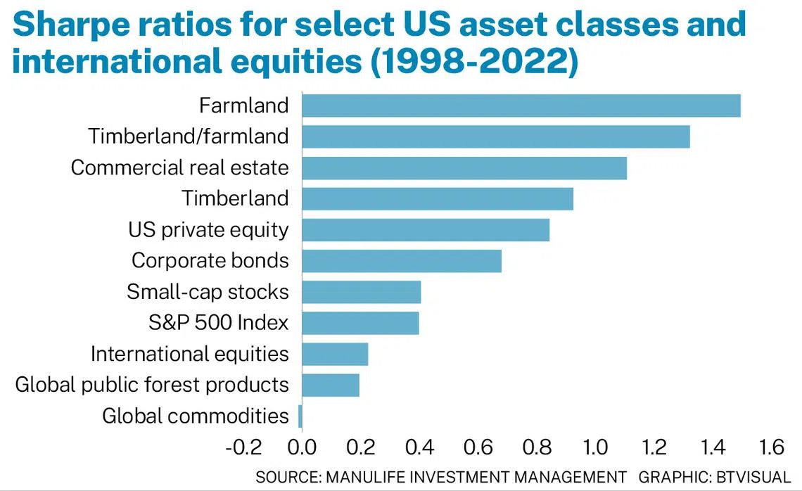 In addition, timberland and farmland have performed well on a risk-adjusted basis over the last 25 years. With Sharpe ratios of 1.47 and 0.91, respectively, farmland and timberland compare favourably against most traditional financial assets.