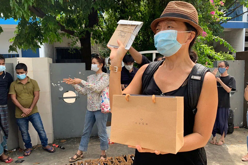 The customised self-care kits - which included hygiene products such as face masks and hand sanitisers - were distributed to the workers in Tuas on Sunday.