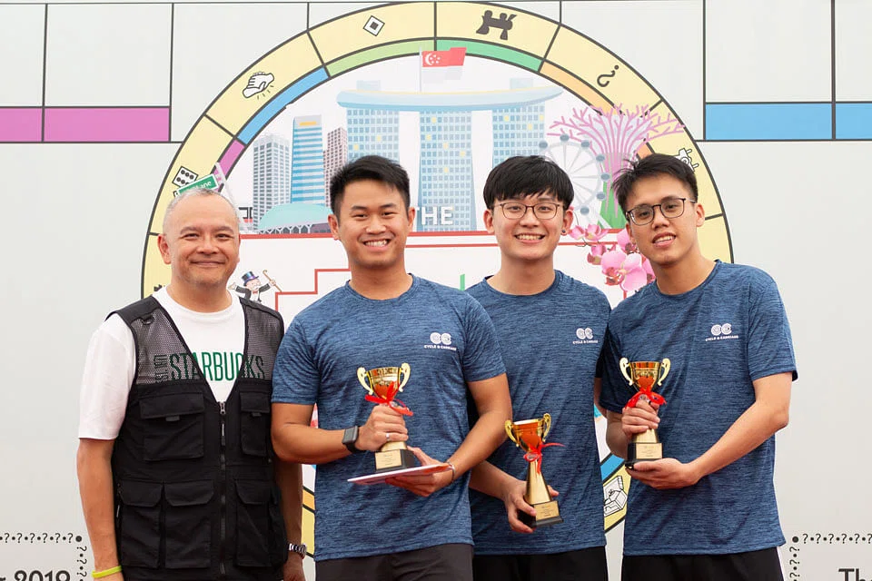 But apparently, the trio - Chia Chong Zheng, Gan Hong Chew and Eric Kho - had both elements as the team emerged champion in the event, which comprised two obstacle courses and a vertical race that involved tackling the steps of the Marina Bay Financial Centre (MBFC) Tower 1.