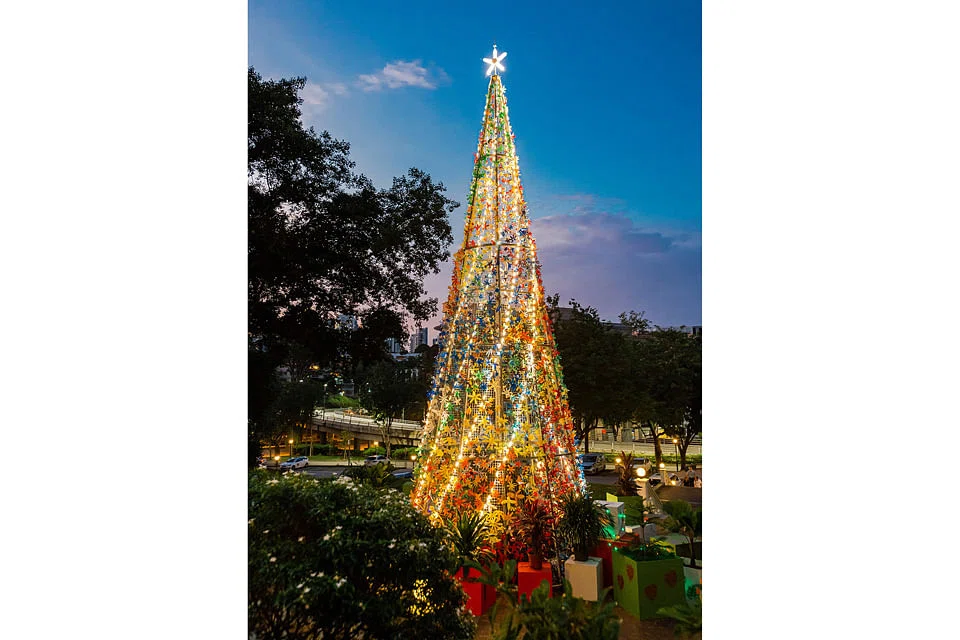 The handover ceremony on Friday was commemorated with the light-up of Singapore's tallest sustainable tree made up of plastic bottles, certified by the Singapore Book of Records. The 12.8-metre tall structure is covered with 6,000 flowers made from 3,000 discarded plastic bottles, which were individually upcycled and handcrafted by volunteers from UBS, LASALLE, Community Foundation of Singapore and community partners.