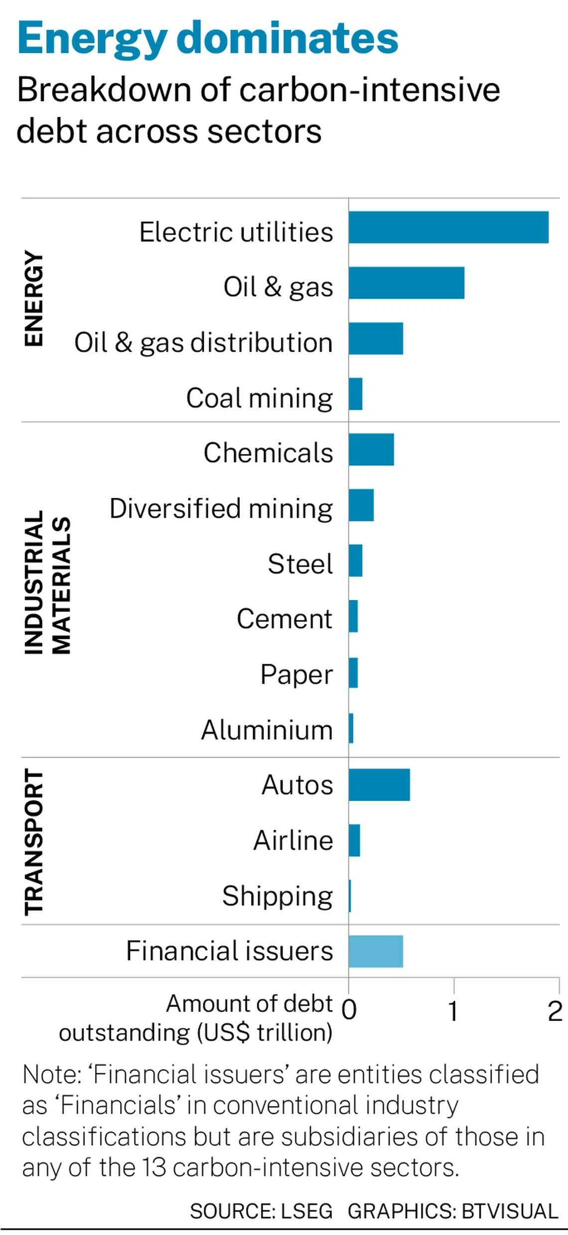 About 29.5 per cent of non-financial corporate debt outstanding as at June 2023 – amounting to US$5.5 trillion – was issued by companies in carbon-intensive sectors and their related entities, LSEG said in its study released on Friday (Mar 22). This surpasses the value of debt of any other non-financial sector.