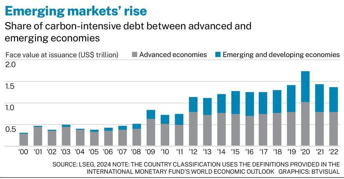 The study also found that emerging markets are playing a bigger role in financing heavy emitters. The share of carbon-intensive debt from emerging markets increased from 4.1 per cent in 2000 to 41.3 per cent in 2022.