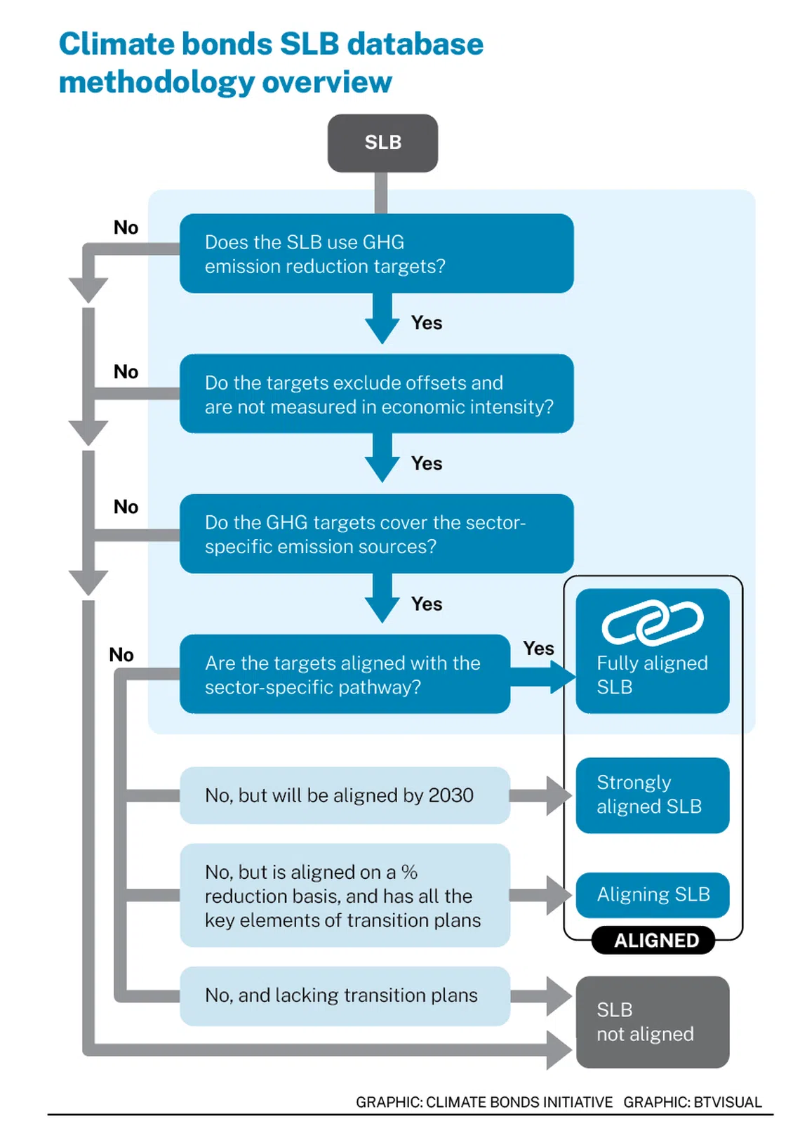 The system, created by the Climate Bonds Initiative, is based on alignment with the Paris Agreement’s 2 deg C goal. Under the SLBDB, bonds are deemed to be “fully aligned”, “strongly aligned”, “aligning” or “not aligned” – depending on factors such as their use of greenhouse gas emissions targets and being in line with sector-specific decarbonisation pathways.