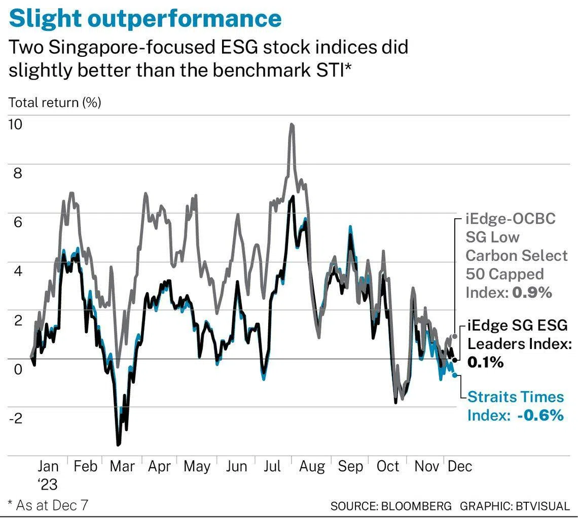 SINGAPORE stock indices focused on environmental, social and governance (ESG) strategies slightly outpaced the benchmark Straits Times Index (STI) in 2023, potentially benefitting from the bullishness over renewable energy.