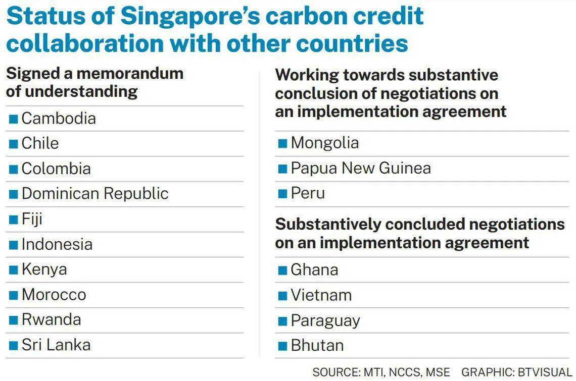 SINGAPORE has inked a number of preliminary carbon credit deals at the UN Climate Change Conference in Dubai, as a national emissions offsetting scheme is set to begin without any eligible credits currently available.