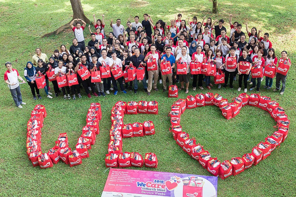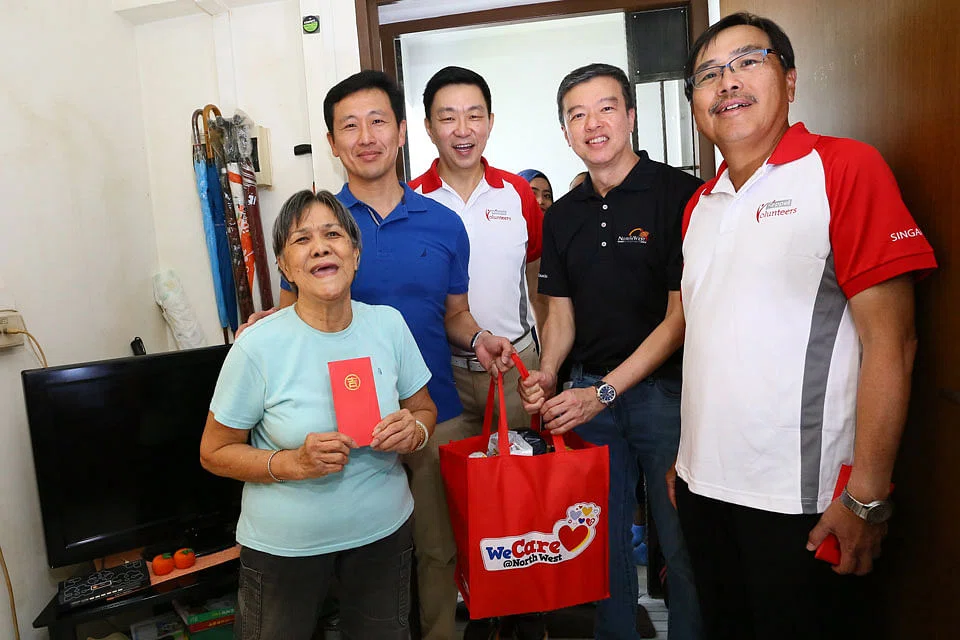 Keppel Land staff volunteers and students from Republic Polytechnic distribute festive packs and CNY red packets to residents in Gambas